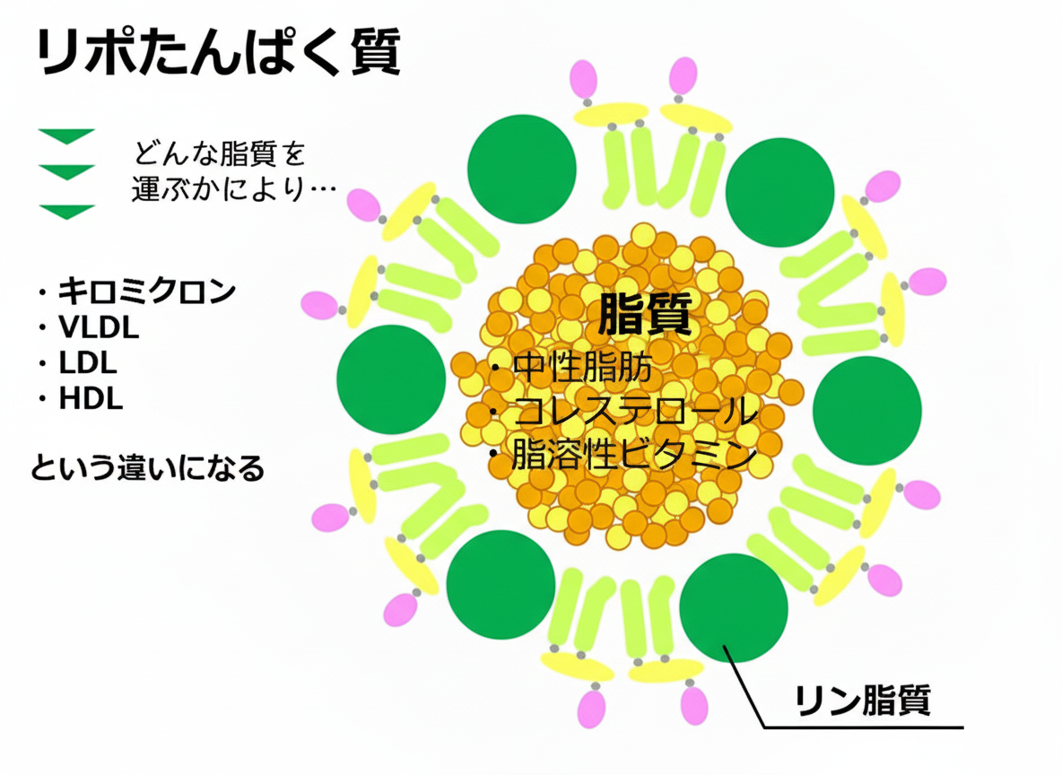 リポたんぱく質とは必要な組織に中性脂肪・コレステロール・脂溶性ビタミンなどを運搬する為の構造物です。